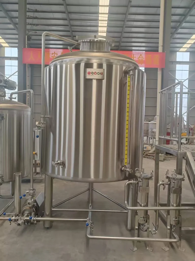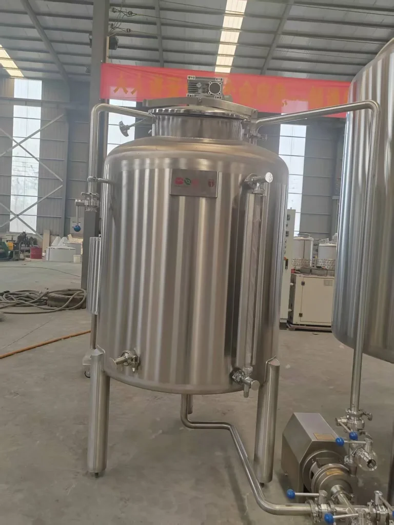 The auxiliary tank in the system supports additional process steps such as holding, circulation, or formulation adjustment. It can also be used as a stainless steel mixing tank or stainless steel blending tank for beverage processing where ingredient consistency and clean transfer are important.